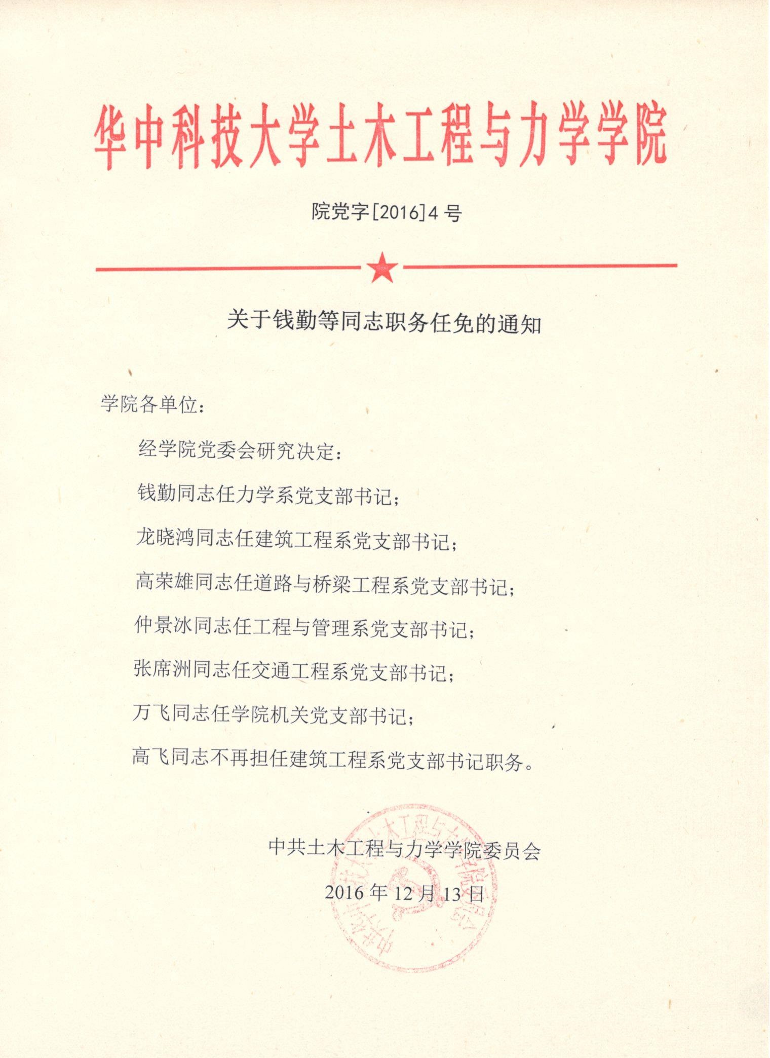 关于钱勤等同志职务任免的通知(公司党字[2016]4号)