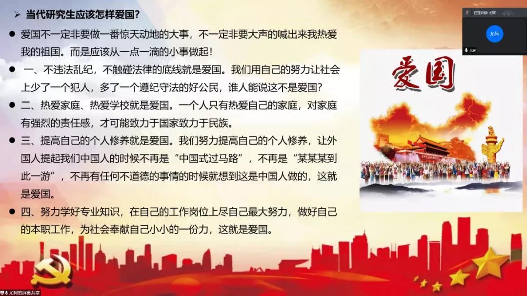 下午两点半,支部成员准时在线上开始了本次的组织生活会。首先支部宣传委员潘杏同志简要介绍了下本次组织生活会的主要内容和基本流程,并引出了 “爱国三问”的话题。