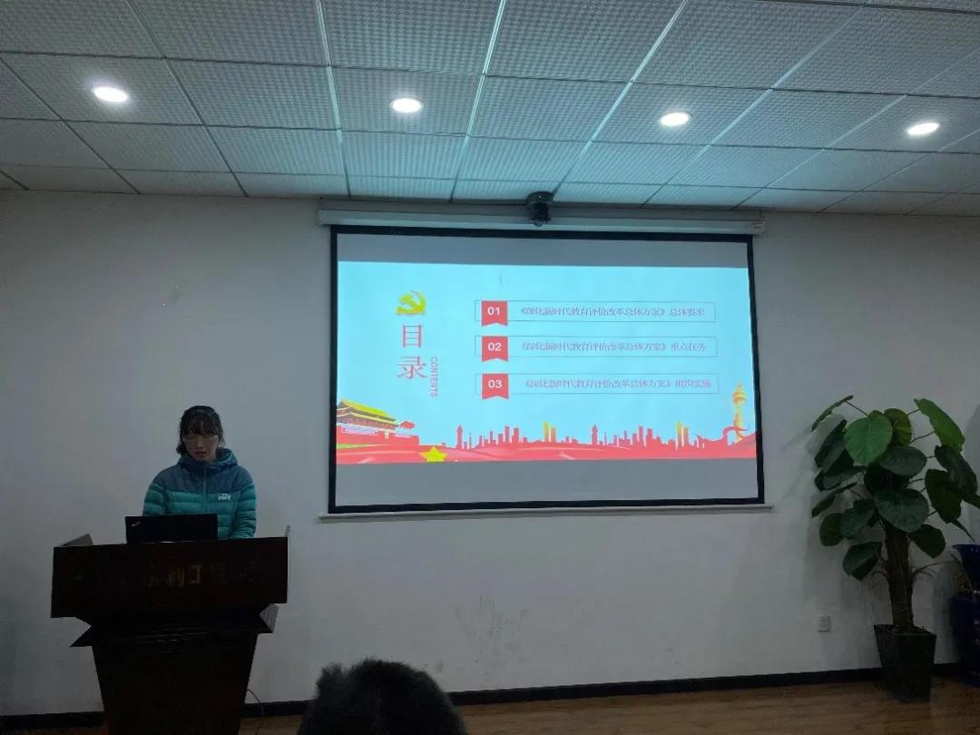 刘露娜同志带领同志们学习《深化新时代教育评价改革总体方案》。重点从“为什么改”、“改什么”和“怎么改”三个方面进行讲述,强调要准确把握核心要义,学习领会思想精髓,为推动改革部署打牢坚实思想基础。
