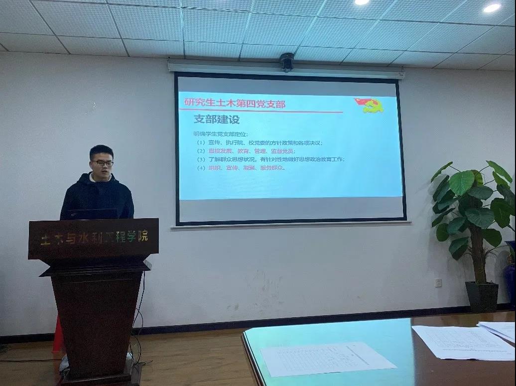会议第一项,支部书记胡俊杰对研究生土木第四党支部2020年工作进行总结汇报,围绕工作概况、支部建设管理、党员培养管理和党员发展四个方面展开。通过总结汇报,同志们对支部概况和工作都有了进一步的了解,并且以成为一名“认真、负责、担当、勇于争先”的优秀共产党员为奋斗目标。