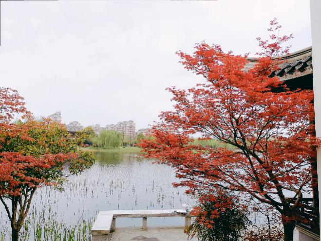 照片拍摄于武汉园博园,园内景观展示了中国以及世界的生态文明。中华上下五千年文化源远流长,春潮春去,花开花落,祖国河山依然如旧。徐徐春风,红叶漫漫。远处,有高楼拔地而起,有杨柳拂风相依。一湖之隔,两种风情。现代文明与传统风光交相辉映,是中华文明发展历程的缩影,是祖国繁荣昌盛的美好象征。