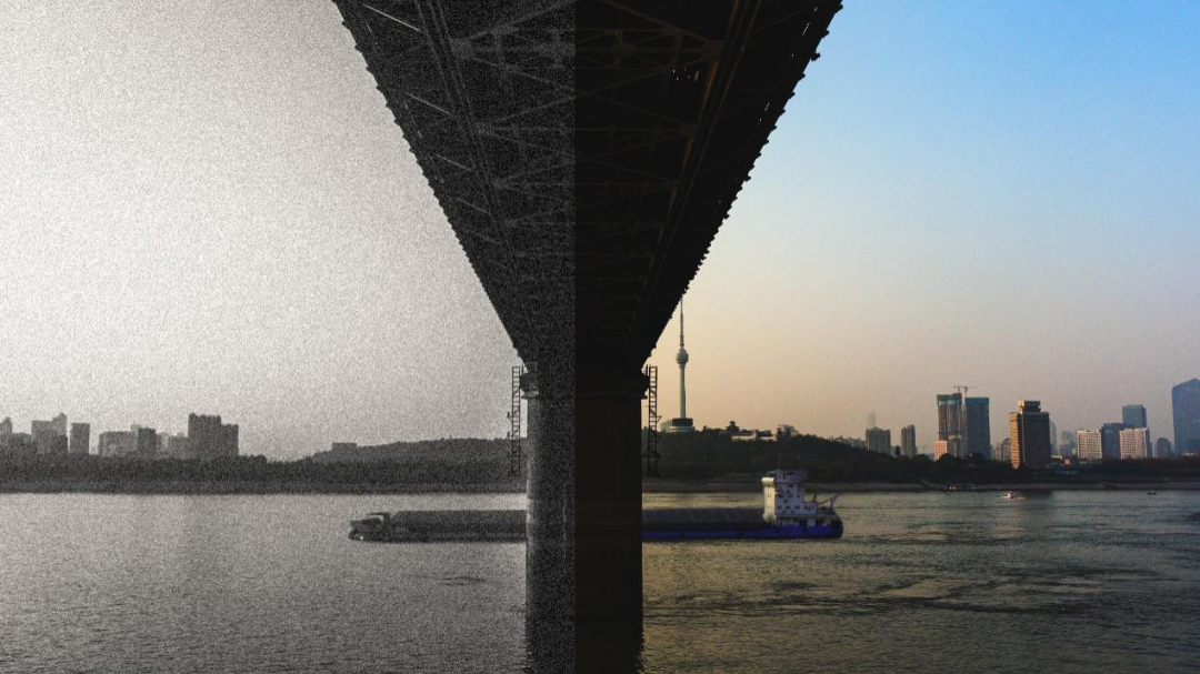 本作品拍摄于武汉长江大桥下,拍摄时正值下午,天气良好。武汉长江大桥是“万里长江第一桥”,“一桥飞架南北,天堑变通途”,它不只连接了武昌和汉阳,更连接了祖国的南北;它不仅见证了武汉的发展,更见证了祖国几十年来的腾飞!因此作品以“连接”为主题,连接的是时间,是几十年前的落后和现在的富饶发达。采用对称构图,做了滤镜切割,左半部分以黑白方式来表现几十年前,就像当时留下的老照片。右半部分为彩色照片,做了饱和度和对比度的提升,用以表现如今的先进发达。画面中心的船乘风破浪,从过去走进现在,表现了作品主题“奋进新时代”。