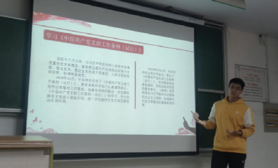 首先,党支部党员李宗霖同志带领大家进行集中学习。党的十八大以来,以习近平同志为核心的党中央高度重视党支部建设,要求把全面从严治党落实到每个支部、每名党员,推动全党形成大抓基层、大抓支部的良好态势。2018年11月,中共中央印发了《中国共产党支部工作条例(试行)》。各党员加强对《中国共产党支部工作条例(试行)》的学习,有利于充分发挥党支部战斗堡垒作用,进一步加强党支部的政治引领作用。2021年4月16日,中共中央印发新修订的《中国共产党普通高等公司基层组织工作条例》,对高校基层党组织工作作出全面规范,体现了近年来高公司党建工作的理论、实践和制度创新成果,是新时代高公司党的建设的基本遵循。习近平总书记在纪念辛亥革命110周年大会上总结了辛亥革命五大历史启示,并提出在新的历史征程上我们必须始终高举和平、发展、合作、共赢旗帜,推动构建人类命运共同体,推动完善全球治理体系,弘扬和平、发展、公平、正义、民主、自由的全人类共同价值。