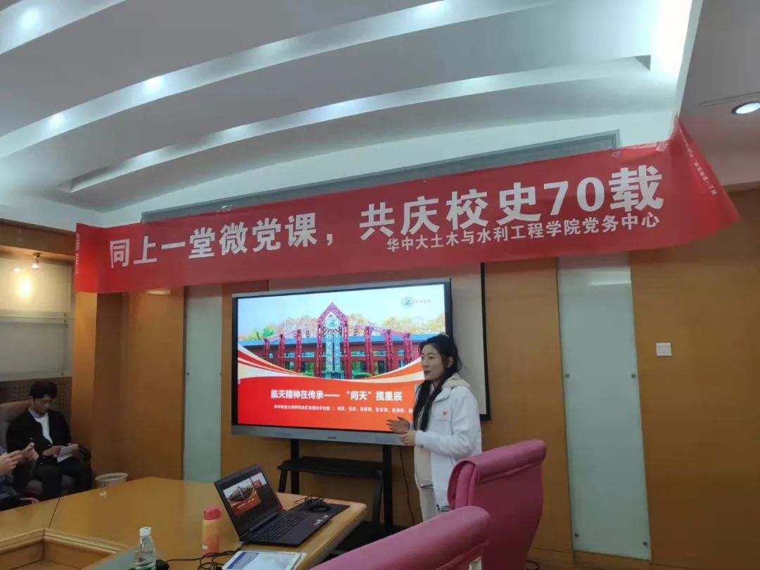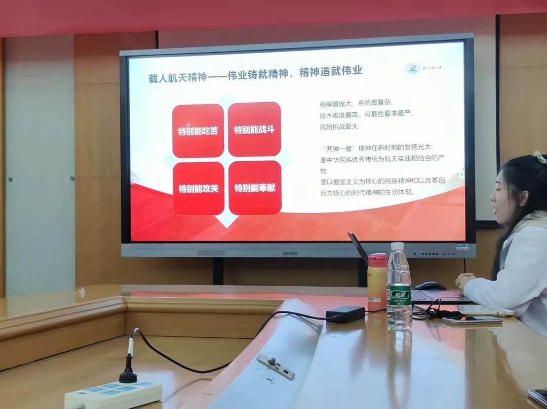 随后,吴晨郡给大家带来《航天精神在传承——“问天”揽星辰》微党课。她为大家讲述了航天精神发展的两个阶段,60多年来,中国航天事业从无到有、从小到大、从弱到强,走出了一条具有鲜明中国特色的发展道路。她介绍了一个个鲜活的航天人物,特别能奉献、特别能吃苦的梁思礼;特别能战斗、特别能公关的王希季......一个个航天英雄都在用自己的行动诠释着伟大的航天精神。