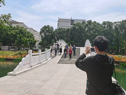 最后,大家来到了美丽的湖溪河畔漫步畅谈。从装饰一新的喻岱桥向北望去,新建的放舟桥从笔直的河道上跨越,清澈河道两旁的生态浮框上种植的水生美人蕉花开正艳,沿岸新建的黄色亲水栈道与绿色的河岸线相得益彰,户外运动课同学们划着单人赛艇在河中竞速,老师们在如诗如画的美景中向员工党员们介绍公司的发展变迁,大家相谈甚欢,合影留念。在一片欢声笑语中,本次“华科印象游”活动圆满结束。