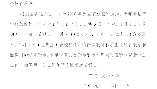 关于2010年元旦节放假的通知