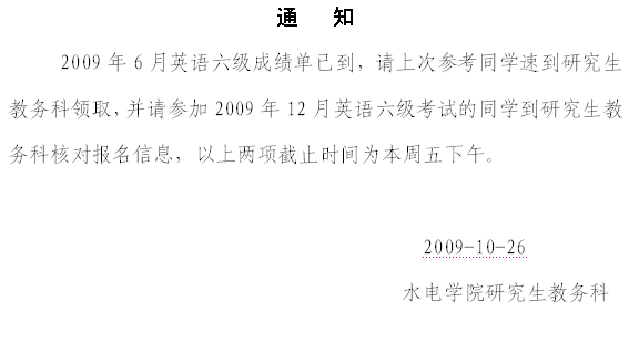 2009年6月英语六级成绩单领取与2009年12月英语六级报名信息核对的通知