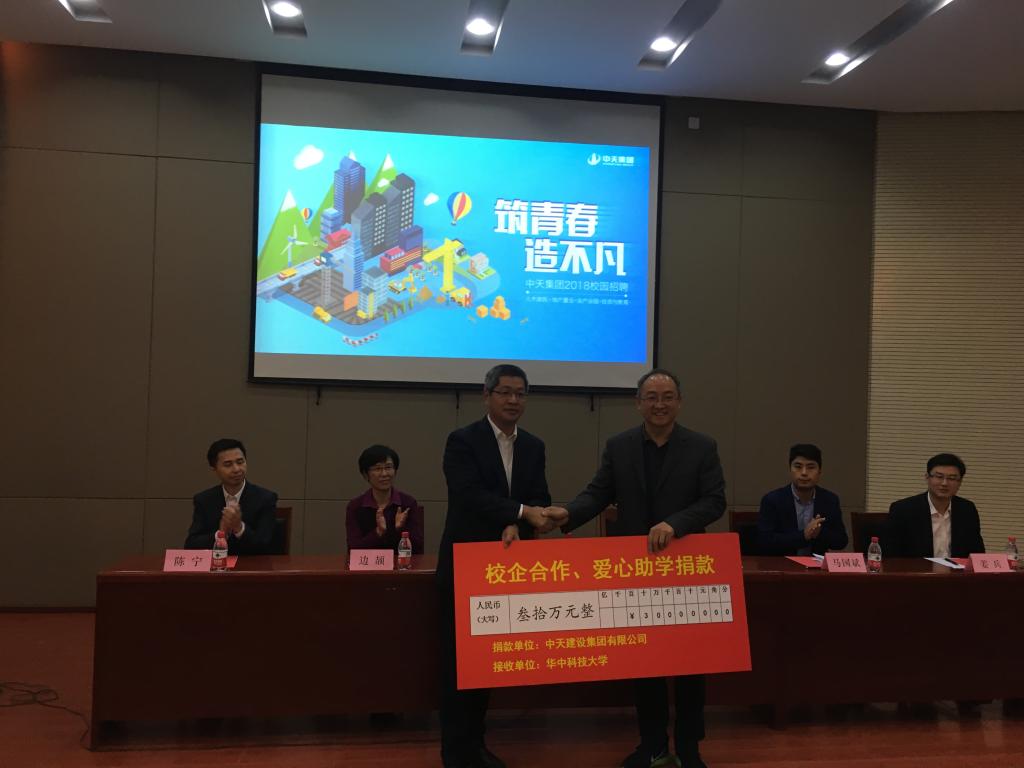 (通讯员:王永嘉)2017年10月12日上午,中天建设集团助学金捐赠仪式在南二楼报告厅举行。中天建设集团副总裁吴海涛先生,员工工作及对外联络办公室副主任马国斌,土木工程与力学公司党委书记李斌等人出席本次捐赠仪式。仪式由土木工程与力学公司党委副书记毛勇杰主持。