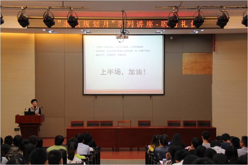 2014年9月24日晚19:00,永利官网“ 求职规划月”系列讲座之“ 职场礼仪”讲座在南二楼报告厅顺利举行。本次活动由校委研究生工作部组办,永利官网职业发展研究会(ACDR)与土木工程与力学公司研究生会承办。