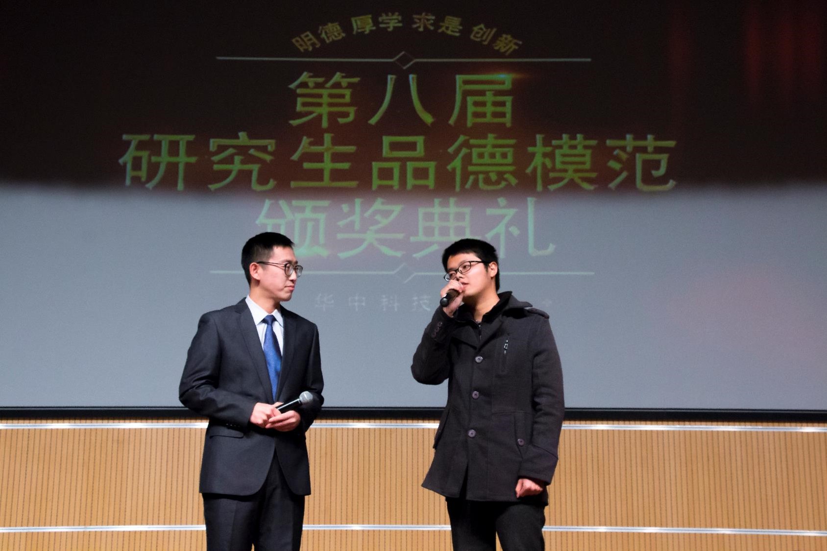 颁奖晚会第一项是歌曲独唱《报答》 ,悠远绵长的音韵,深情款款的旋律,仿佛是对品德模范动人事迹的诠释。随后典礼着重介绍了10位研究生品德模范的获奖缘由,并对包括来自土木工程与力学公司的葛伟、常怀宽等获奖同学依次颁发奖励。