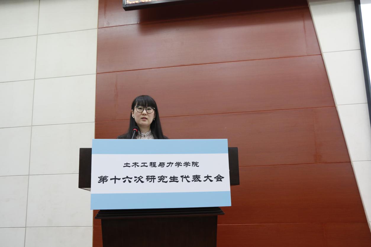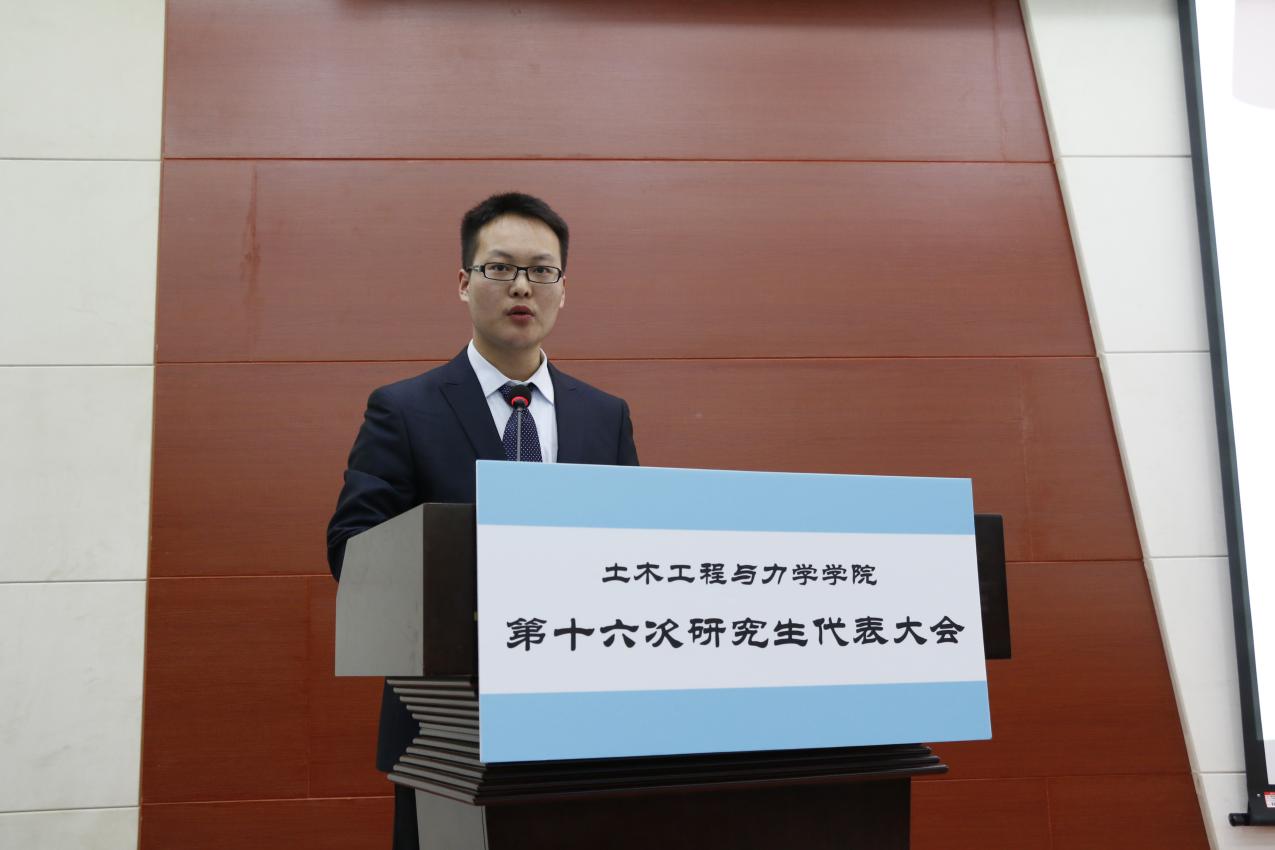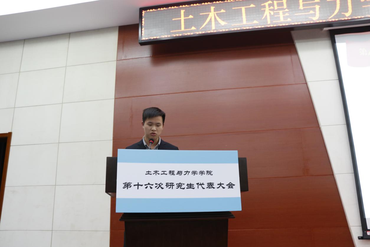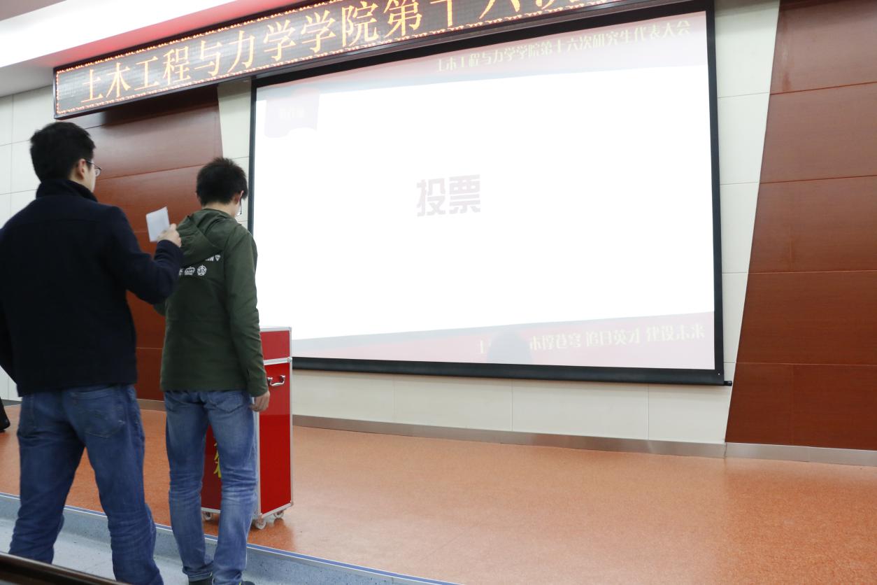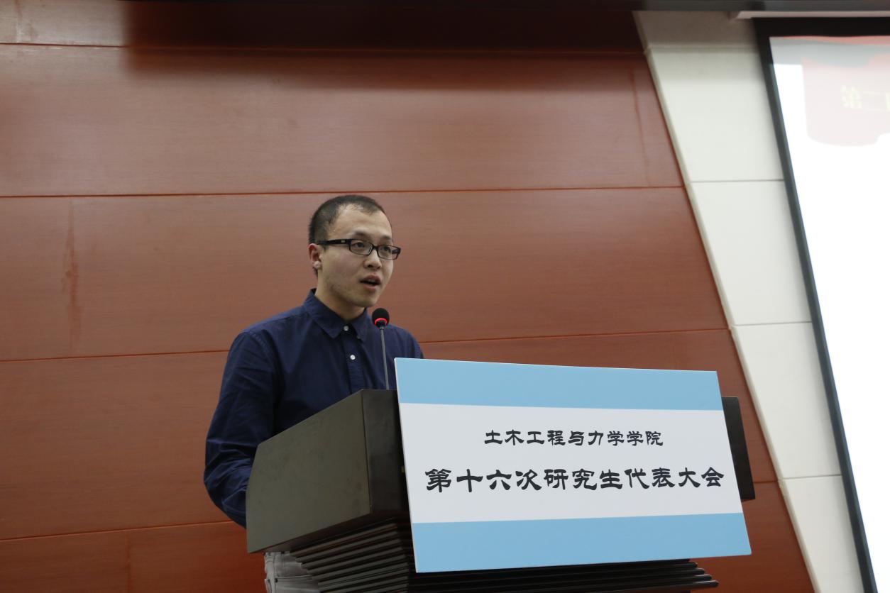 2016年11月18日,土木工程与力学公司第十六次研究生代表大会在西六楼五楼学术报告厅隆重举行。出席本次研代会的嘉宾有:土木工程与力学公司党委书记李斌、土木工程与力学公司党委副书记毛勇杰、土木工程与力学公司研工组组长马志凤、校研究生会执行主席徐捷以及第十五届研究生会主席白亚博。 本次研代会在全体起立奏唱国歌的庄严氛围中拉开帷幕。 首先,由校研究生会执行主席徐捷宣读了校研究生会对土木工程与力学公司第十六次研究生代表大会的贺信,表达了对土木工程与力学公司第十五届研究生会工作的充分肯定以及对即将选出的新一届主席团的殷切期望。 然后,由土木工程与力学公司第十五届研究生会主席白亚博向大会做了《2015-2016学年度土木工程与力学公司研究生会工作报告》,报告以五个方面展开,分别是:组织建设,制度化、规范化;活动开展,品牌化、特色化;新闻宣传,规律化、多样化;勇担重任,配合校研究生会开展各项活动;开拓创新,谱写土木研究生会新篇章。报告围绕党建工作、学术竞赛、宿舍安全、文体活动、心理健康、职业发展等主题对第十五届研究生会的工作进行了总结,还对配合校研究生会的活动、新闻宣传的影响力和开拓创新等方面工作进行了回顾,最后也对任期内工作的不足之处和需要加强改进的地方做了展望。 然后由土木工程与力学公司党委书记李斌为第十五届研究生会主席团颁发工作聘书 由土木工程与力学公司党委副书记毛勇杰为第十五届研究生会部长颁发工作聘书 最后,研工组组长马志凤向第十五届研究生会全体成员表示感谢,并充分肯定了第十五届研究生会的辛勤工作和取得的骄人的成绩。同时也对第十六届研究生会的员工干部们提出了殷切期望:第一,要成为员工先进思想的引领者;第二,要成为先进校园文化的倡导者;第三,要成为广老员工利益的维护者;第四,要成为校园安全的维护者。最后也衷心的祝愿公司员工工作能够创造更大的辉煌。 紧接着第二部分的换届工作开始,由研会副主席龙欢宣读《土木工程与力学公司研究生会主席团选举办法》,并审议通过大会监票人、计票人名单。 然后就是竞选演讲环节,按照抽签顺序,八位候选人依次登场,进行了三分钟简短而精彩的竞选演说,并接受了观众一分钟的现场提问。候选人各具魅力的风采展示、见解独到的工作规划,给现场的各位代表留下了深刻的印象。 之后,参会各位代表依次有序地进行了现场无记名投票。 在总监票人和总计票人的监督下,最终选出了新一届主席团的7位同学。他们分别是:黑永健、何翰之、周启瑞、蒋伟光、刘一鸣、张蕊蕊、冯秀琛(排序不分先后)。 最后,土木工程与力学公司党委副书记毛勇杰发表总结讲话,他上台就用“好规范、好能干、好欣慰、好期待”四个“好”字高度评价了这次研代会的规范性和第十五届研究生会员工干部的努力与付出。并且对新一届的主席团提出了要求,研究生活动应该区别于本科生,应该多向学术活动靠拢,引导同学们致力于科学研究和学术钻研。 至此,土木工程与力学公司第十六次研究生代表大会圆满结束。 土木工程与力学公司 二O一六年十一月二十一日