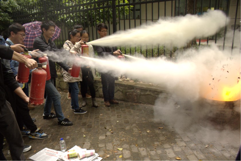 讲座结束后,毛老师带领同学们在西六楼西侧空地展开模拟灭火演习活动,通过实景灭火,消防车体验等方式深化了同学们对于消防安全操作的理解。