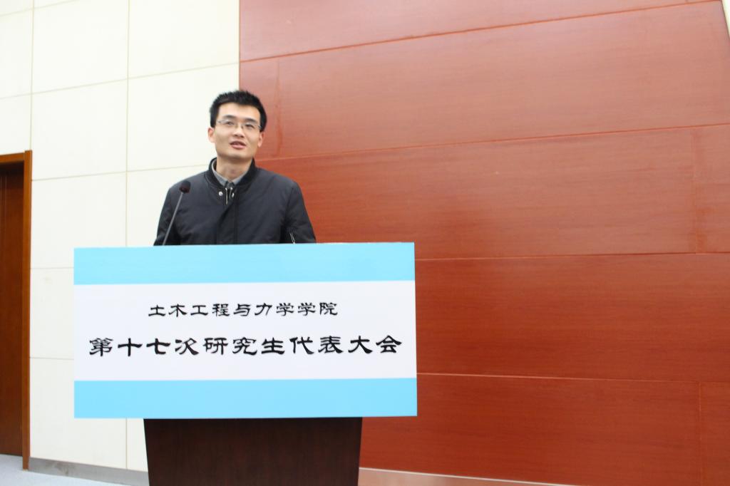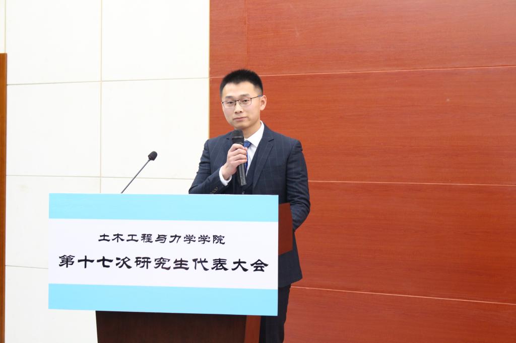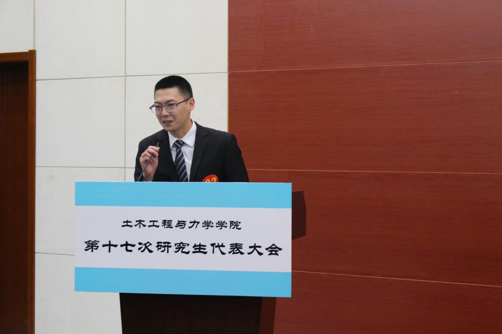 大会第三项,校研究生会副主席徐明宇宣读了校研究生会对土木公司第十七次研究生代表大会的贺信,表达了对土木公司第十六届研究生会工作的充分肯定,以及对即将选出的新一届主席团的殷切期望。