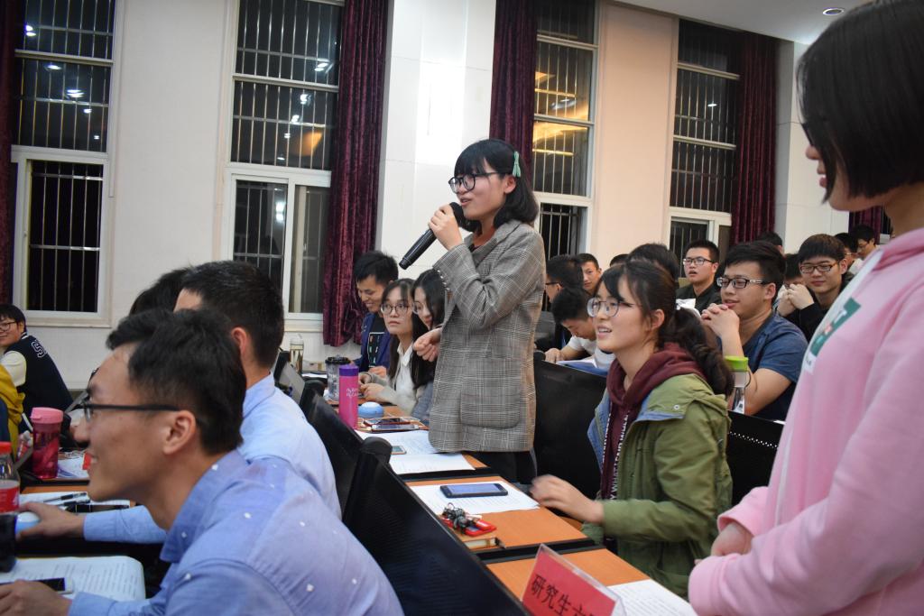随后,主持人宣布竞赛环节开始。第一轮为抢答环节,抢答内容为根据红歌选段或影视片段分别猜歌名或影视作品名称。在本环节中,研究生第五、六队凭借其宽广的知识面、深厚的文化素养拔得头筹,成功晋升擂主。第二轮为攻擂赛,即将队伍分为两组,实行组内轮流攻擂。其中,研究生第六队在比赛中应对冷门知识点时静若泰山,先后抵挡住组内四轮攻击,他们的出色表现赢得观众阵阵掌声,不过遗憾的是两队均未能守住擂主之位。第三环节为季军争夺赛,由除擂主外的前两名队伍进行季军争夺。有趣的是,研究生第五、六队在本环节中狭路相逢,究竟最终花落谁家,让人很是期待。两个势均力敌的队伍经过几轮的纠缠,研究生第五队惜败。最后环节为王者争霸赛。经过四轮激烈比拼,研究生第四队、本科生第五队、研究生第六队分别获得了一、二、三等奖。比赛结束后,嘉宾为获奖队伍颁奖并合影留念。