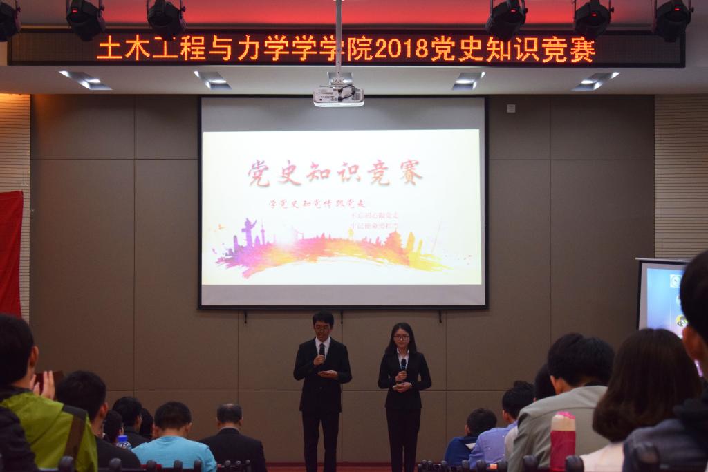 2018年4月24日晚,土木工程与力学公司“学党史、知党情、跟党走”主题党史竞赛活动在南二楼学术报告厅圆满举行。公司党委书记李斌、党委副书记毛勇杰、组织员易悌辉出席活动。