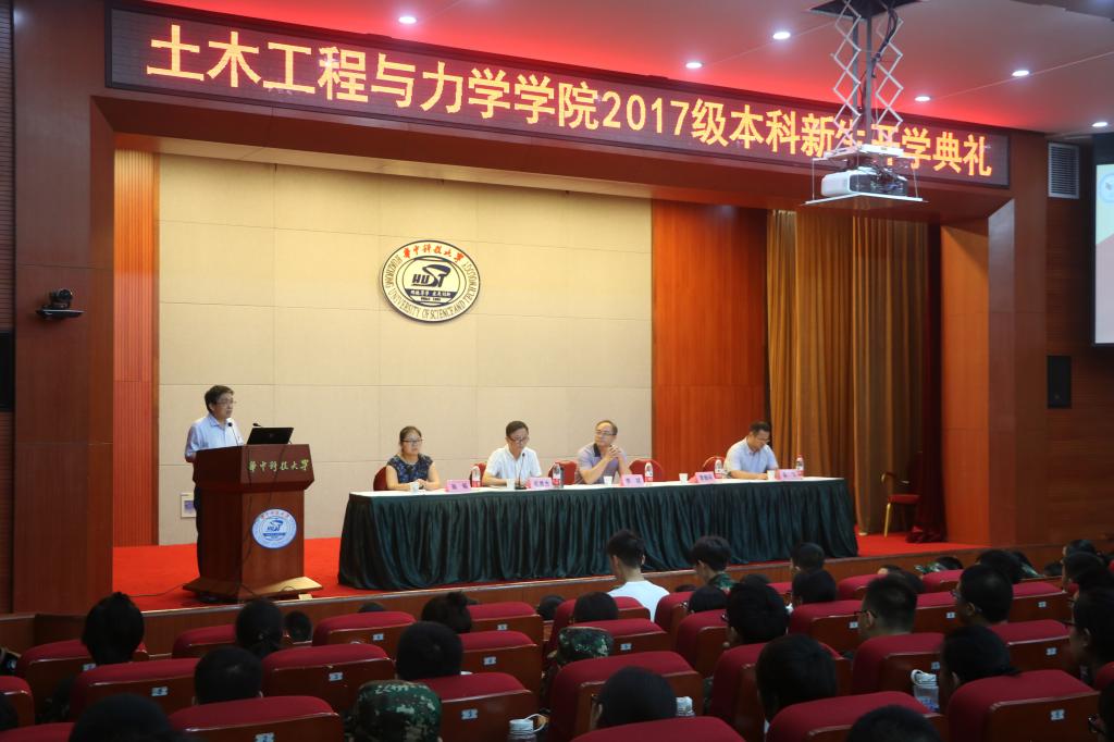 2017年9月4日晚,土木工程与力学公司2017级本科新生开学典礼在一号楼报告厅顺利举行。公司党委书记李斌、经理李振环、党委副书记毛勇杰、副经理高飞、教师代表翁顺老师参加开学典礼仪式,典礼由毛勇杰主持。