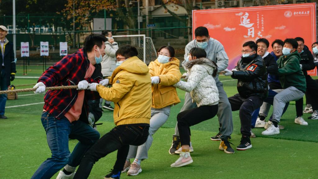 主持人宣布闭幕式开场后,随着一声哨响,紧张激烈的师生拔河比赛开始。比赛中,各队参赛队员们手握长绳,卯足了劲儿向后拉,未参赛的同学也自发组成啦啦队,为队员们呐喊加油,哨子声、呐喊声此起彼伏,给比赛增添了一抹亮色。