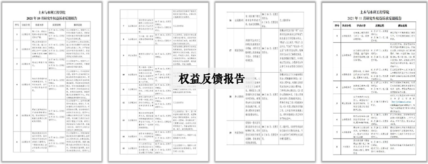 自2021年秋季学期以来,利用“华中大土木研究生”公众号定期发布权益反馈报告,保证诉求反馈长期开展、困难诉求长期跟进、处理过程长期公开。截至目前,共收集归纳权益诉求30项,其中处理完成28项,剩余2项仍在常态化跟进。