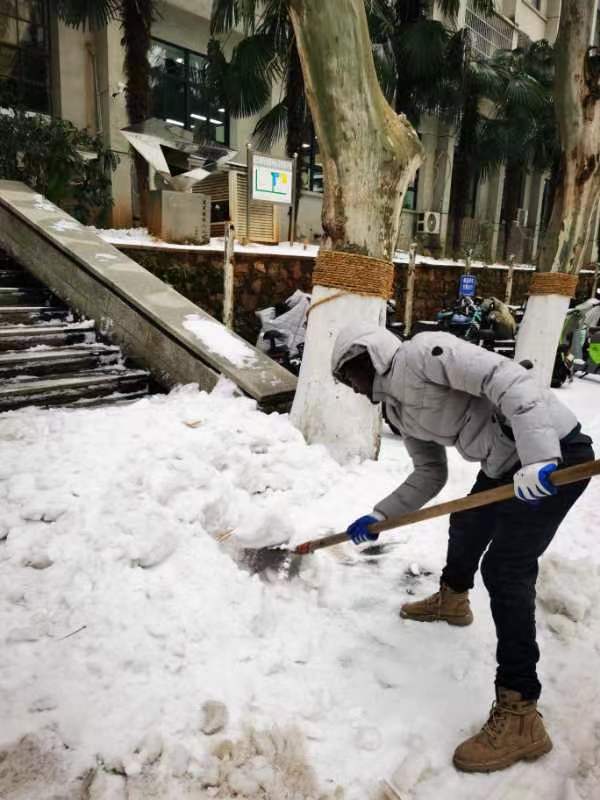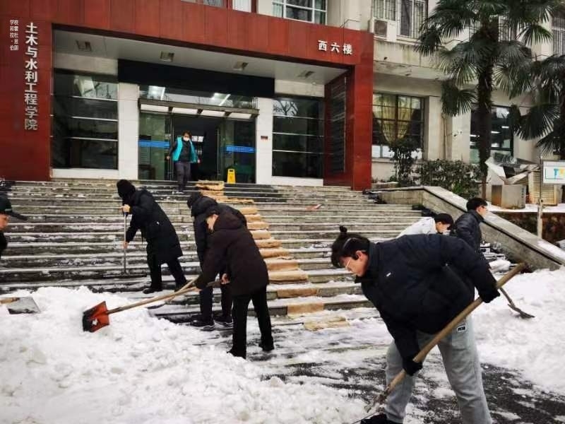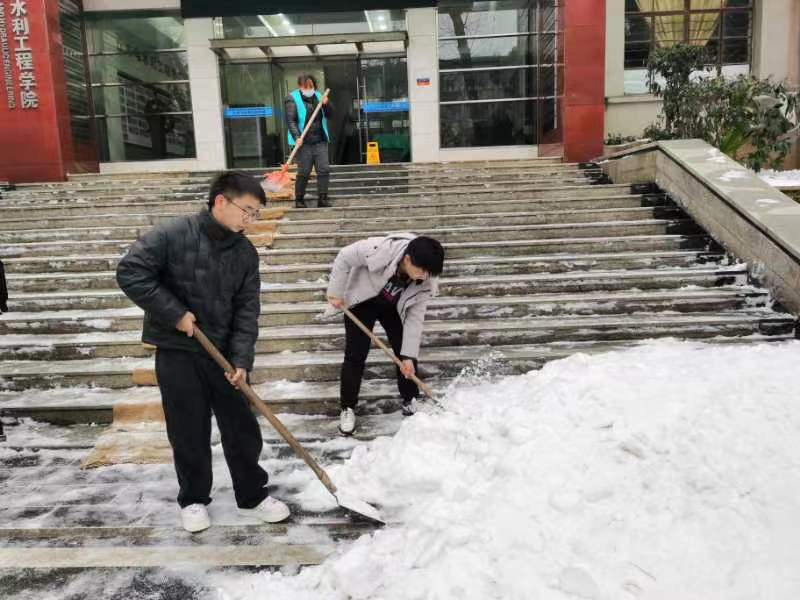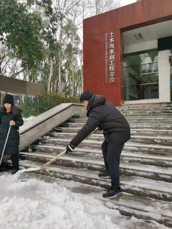 在应对雨雪冰冻灾害的严峻形势下,yl23455永利展现出师生员工的积极面貌,在公司党委积极组织下新生党员踊跃报名参与到扫雪除冰行动。皑皑白雪下的西六楼煞是好看,可在大雪覆盖下,上楼仅剩一条供单人通行的小路。为方便楼内师生出行,保障同学安全,大家拿起雪铲,做起了雪的搬运工,一铲一铲地清理台阶表面。秉持着“务实担当,团结奋进”的精神,在清理积雪后,他们又用铁铲将台阶上的冰面一点点凿碎,人到雪除不给大家留下任何安全隐患。