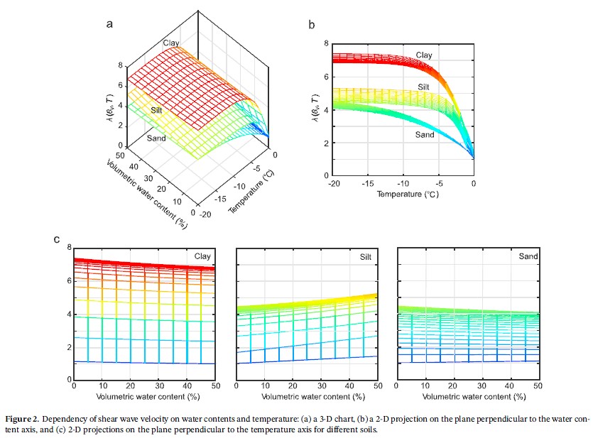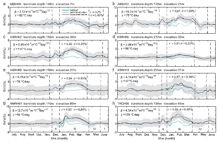 研究团队利用地震干涉测量法从地震记录中提取了近地表剪切波速,之后根据气象记录研究了季节性冻土对近地表剪切波速的影响,并结合室内共振柱试验得到的冻土剪切波速与温度及含水量的关系,发现了季节性冻土对近地表剪切波速的影响主要受冻结深度和冻结程度两个因素共同控制,并提出了用于估计季节性冻土对近地表剪切波速的经验公式。