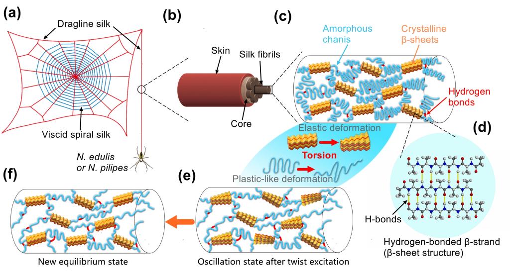 蜘蛛丝是由蜘蛛的腺体分泌的一种生物蛋白质纤维,因其具有其优异的力学性能、精巧的分级结构和潜在的应用前景,受到了国内外学者的广泛关注。蜘蛛在其生命历程中,会因生存需要或外界刺激产生多种性能和功能不同的丝,其中以大壶状腺纺出的牵引丝力学性能最为优越,是人类已知最强韧的材料之一,也是蜘蛛从高处安全降落的“生命线”。但是过去的研究多集中于其拉伸力学性能,鲜有涉及其扭转力学性能的详细报道。