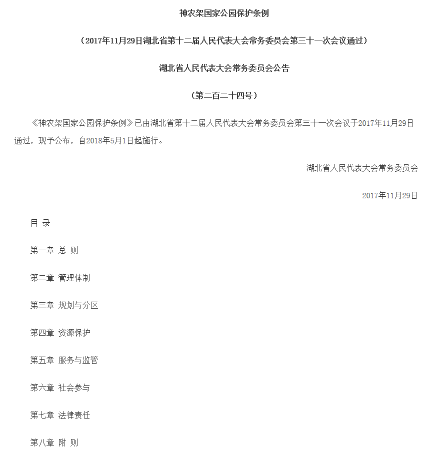 2017年11月29日,湖北省人大常委会第三十一次会议高票通过《神农架国家公园保护条例》。《条例》自明年5月1日起施行,标志着我省正式开启立法保护国家公园时代。公司承担了该《条例》的起草工作,张伟副教授为该条例的第一起草人。