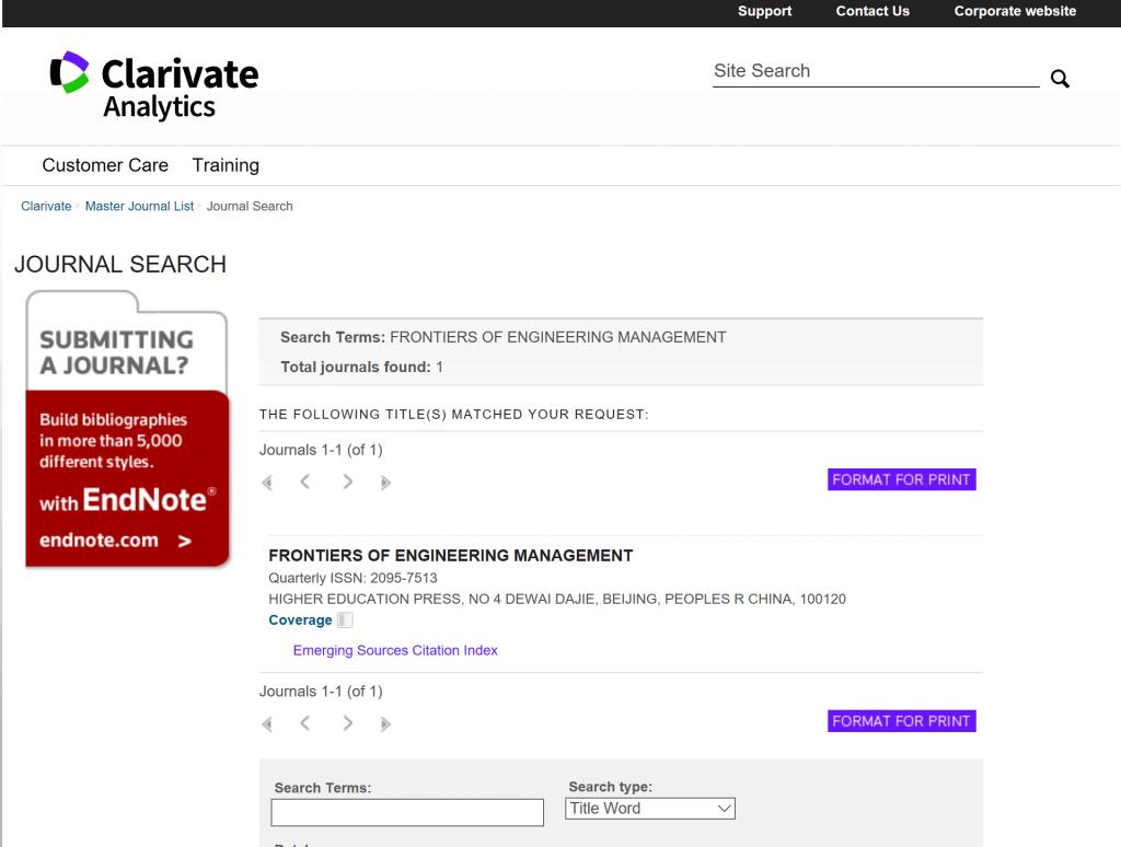 近日,根据汤森路透公司最新公布的ESCI(Emerging Sources Citation Index)数据库,《Frontiers of Engineering Management》(《工程管理前沿》,国际标准刊号为ISSN2095-7513,国内统一刊号为CN10-1205/N)期刊成功入选ESCI。ESCI数据库综合考虑期刊投稿文章的质量和数量、期刊编委队伍和编辑部、出版社的服务质量,每年从申请的期刊中遴选10%-15%进行扩容。随着SCIE数据库的不断扩展,入选ESCI数据库的期刊将具备优先进入SCIE数据库的优势。