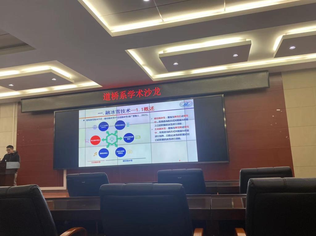 在第七期学术沙龙中,许培欣博士围绕在硕士期间所做的科研工作,为大家简述了多种现有的路面除冰雪方法,并对其适用性进行了评价,重点关注混凝土道面内置发热电管/电缆融冰雪技术,分析这种特殊的路面结构在内部循环温度应力作用下的损伤劣化行为及其结构优化设计;为了进一步提高路面除冰雪效率,基于两种工业废弃材料设计了一种具有能量定向转化能力的感应加热沥青路面复合结构,与传统除冰雪方法相比,感应加热除冰效率能够提高10倍左右,综合经济与效益评估表面复合结构在提升除冰效率的同时,带来了显著的经济环保效益。