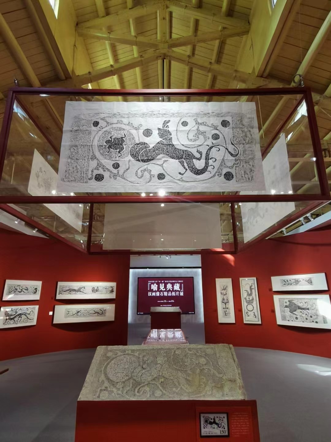 展览中《嫦娥奔月》(进门第一件展品):画左上方刻一轮满月,月内有蟾蜍,其右女子为嫦娥,她人躯蛇尾,面向月轮作飞升状。画间繁星点点,云气缭绕。其原石复制品同时展陈。1999年国家邮政局发行过一套六枚的汉画像石特种邮票,其中第六枚就来源于此图。2012年6月,我们的《嫦娥奔月汉化像石拓片以及《河伯出行》汉画像石拓片搭乘着神舟九号载人飞船完成了一次奇妙的太空之旅。