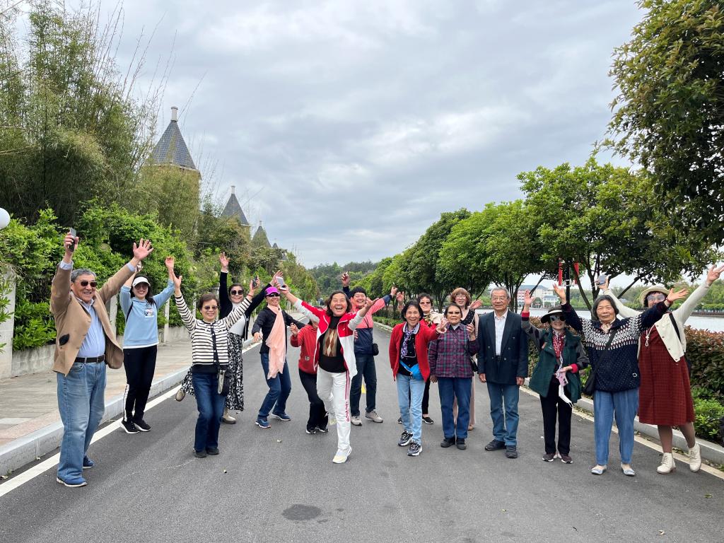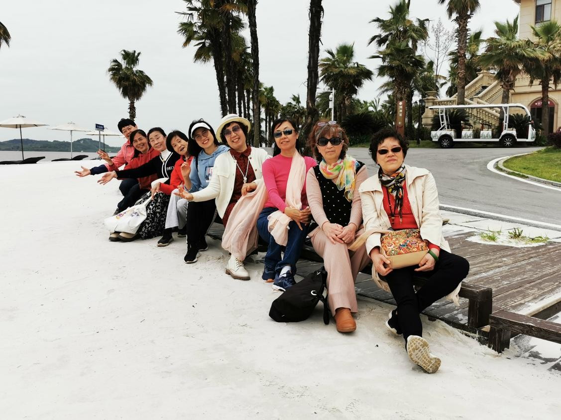上午八点半从公司出发,将近2小时的车程,来到目的地。大家兴致勃勃地在入院处合影。园内只见宽敞的绿道、漂亮的木屋别墅、整齐的树林,呼吸着新鲜空气,沐浴着灿烂阳光,微风徐徐,令人心旷神怡。经过曲悠小径,与路边盛开的山茶花来一张合拍。穿越孔明桥,走过廊亭水榭,来到罗马广场,仿佛置身欧洲的佛罗伦萨,在许愿池前许下今年最美好的愿望。再往前只见白色的沙滩映入眼帘,一排排整齐的棕树,一张张躺椅和帐篷,平静的湖面,老同志们忘记了年龄和疲惫,在沙滩上欢快地合影留恋。