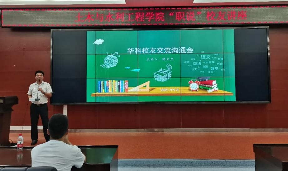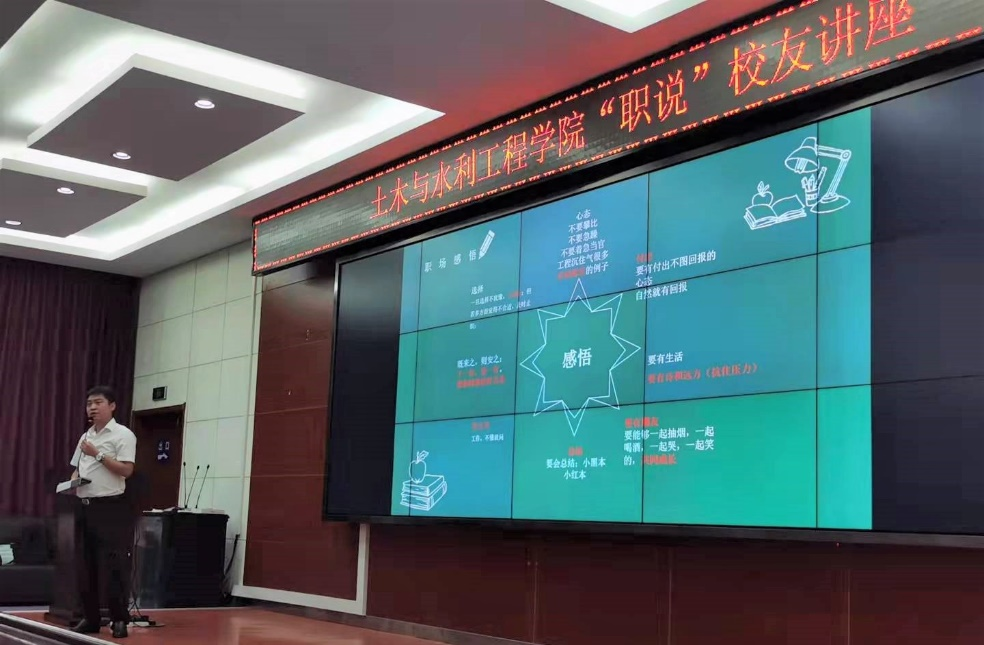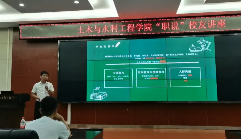 讲座刚开始,陈文杰回顾了自己十多年前的老员工活。陈文杰曾就读于公司土木工程专业,在校期间辅修武汉大学工商管理双学位,担任班级文艺委员,加入院文艺部、校创业中心,参加过辩论赛、歌手大赛、足球篮球比赛等。再忆老员工活,陈文杰学长告诉同学们在公司要打下坚实的基础,培养三种能力。首先要培养专业能力,掌握识图纸、用CAD、懂力学的基本知识。其次要培养组织管理与逻辑管理能力,尝试策划、组织会议活动。最后还要培养人际沟通能力,在校我们应该开始掌握沟通技巧、尝试与人交流、学会控制情绪。