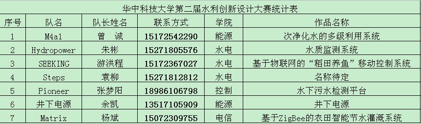 1、本次大赛共有16支队伍、16项作品入围初赛。经永利官网第二届水利创新设计大赛评审委员会本着“公平、公正、公开、科学、规范”的原则,通过设计资料审阅,从参赛作品的选题、方案设计、结构设计和制作等方面,对作品的合理性、创新性、实用性、先进技术的应用,筛选出7支队伍、7项作品进入决赛:作品列表如下: