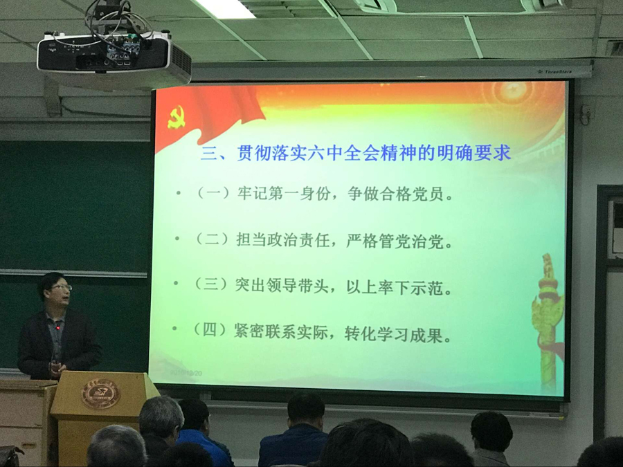 2016年12月20日下午2:30,水电公司在岗、退休教职工党员和部分员工党员代表,在公司党政负责人的号召和带领下,在西十二教学楼S103,一同参加了公司统筹安排的十八届六中全会精神宣讲会的学习活动。