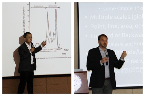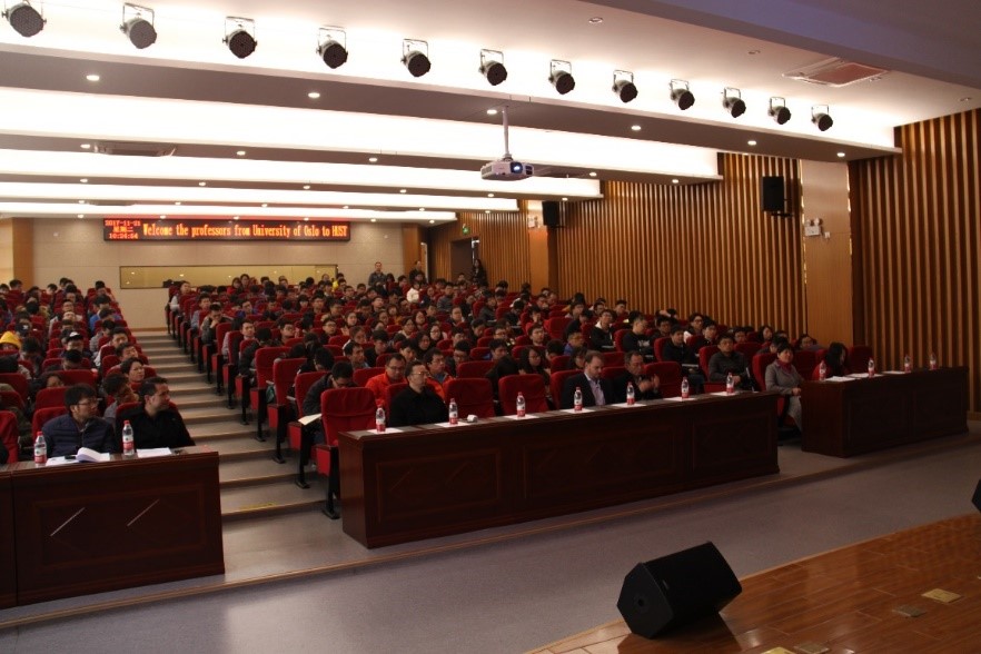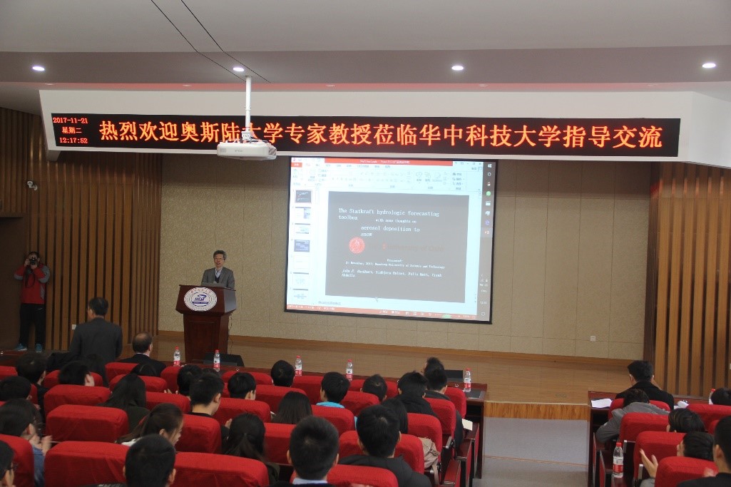 许崇育教授本次报告主题是“应对变化环境的水文学研究挑战和重点(Challenges and priorities in hydrology research towards the changing environment)”。John Faulkner Burkhart副教授本次报告主题是“用于多模型假设检验的群体研发水文模型工具箱(A hydrological simulation toolbox for community development of multi model hypothesis testing)”。两位教授在报告中深入浅出,举一反三,先后对环境变化下水文水资源研究的研究重难点和应对策略、用于多模型假设检验的群体研发水文模型工具箱的意义和应用实践进行了重点讲解。当场解答了同学们提出的问题,并结合当前形式,对水文水资源专业知识进行了全面解读,使同学们认识到,水文水资源是未来水利与地球环境学科必不可少的研究领域。学术气氛热烈而轻松,两位教授亲切朴实的语言、幽默风趣的谈吐、深厚的学术修养赢得了师生的阵阵掌声。同学们在聆听讲座中秩序井然,表现出了极大的学习兴趣。
