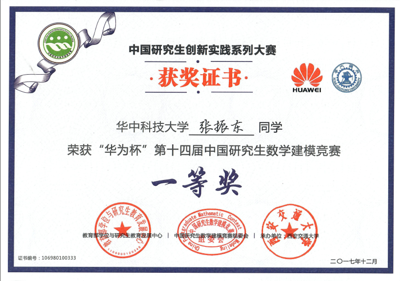 2017年12月15-17日,“华为杯”第十四届中国研究生数学建模竞赛颁奖大会在西安交通大学举行,水电学子“征战小队”成员获邀参加颁奖典礼和大会学术交流。“征战小队”成员为研究生刘永琦、周华艳和张振东,荣获“华为杯”中国第十四届研究生数学建模竞赛一等奖。一等奖150队,获奖比例为1.44%。