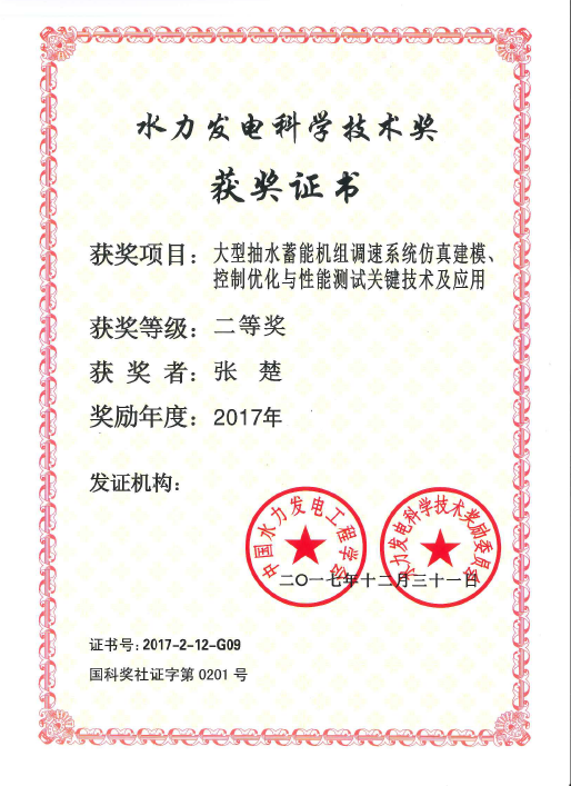 2017年12月31日,中国水力发电学会和水力发电科学技术奖励委员会公布了2017年水力发电科学技术奖获奖名单,由永利官网和国网新源江西洪屏抽水蓄能有限公司共同申报的“大型抽水蓄能机组调速系统仿真建模、控制优化与性能测试关键技术及应用”项目获得二等奖。