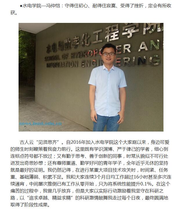 冯老师在2016年加入水电公司以来,时刻鞭策自己奋力向前,全年近乎无休。先后申请5项国家发明专利,以第一/通讯作者在《Energy》等权威期刊录用论文20余篇(SCI刊源19篇、平均影响因子4.18),其中2篇入选ESI高被引论文、1篇入选中国精品科技期刊顶尖学术论文(F5000),同时担任多个权威期刊审稿人,荣获《Energy》、《Applied Soft Computing》、《Science of the Total Environment》、《International Journal of Electrical Power & Energy Systems》等4个期刊的“Outstanding Reviewer”;同时主持了国家自然科学基金、国家重点研发计划子课题、湖北省自然科学基金等多个项目,参加了国家自然科学基金重点支持项目、重大国际合作项目等多项课题以及三峡集团公司等合作单位委托的多项工程生产项目,参与研发的水电调度系统在省级电网、特大流域、巨型电站得到实际应用,是当之无愧的学术楷模。