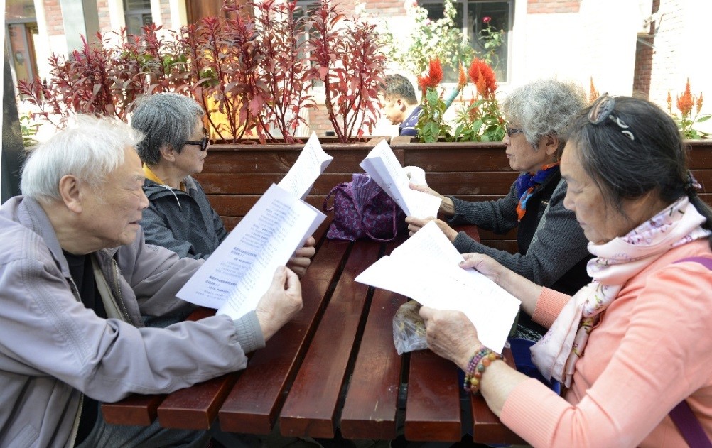 图1:户外,老同志一同研读二级关工委、公司有关离退休工作文件