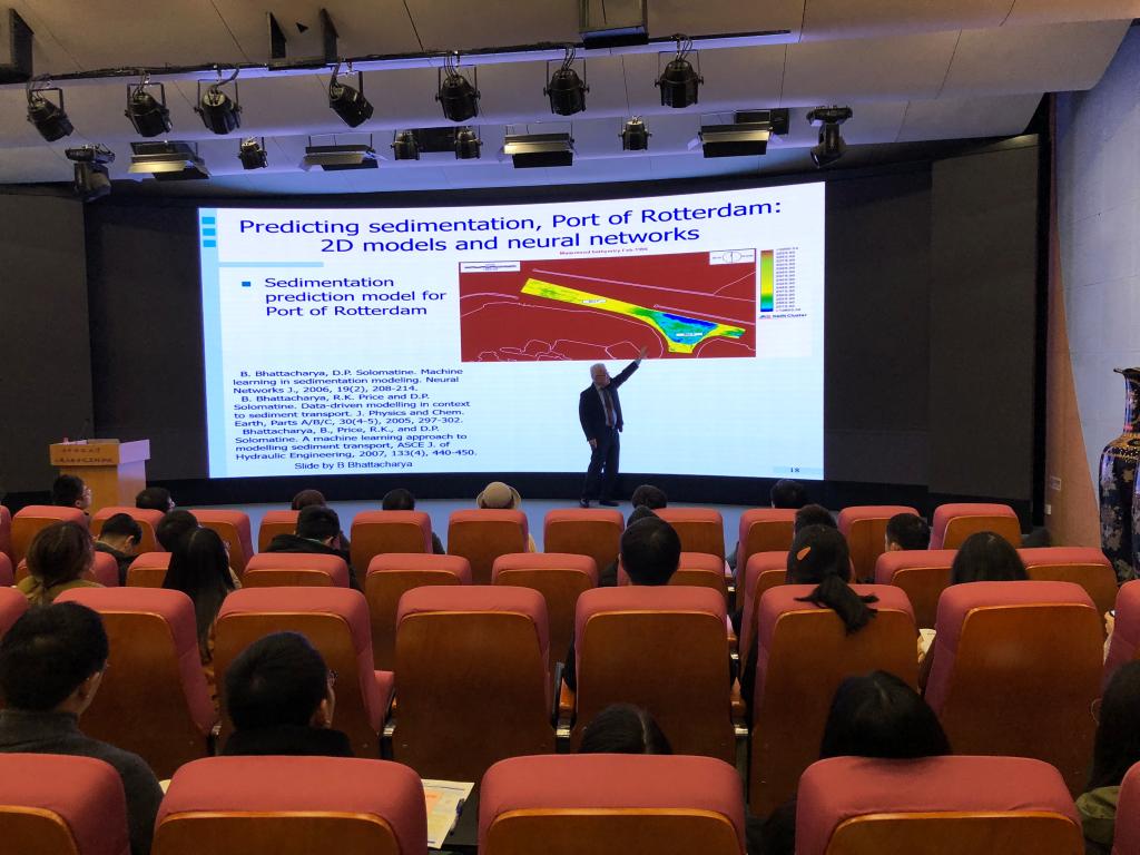 第一场讲座中Dimitri教授首先介绍了水信息学的定义,紧扣学术热点问题,对水资源管理的发展历程及关键技术做了深入浅出的讲解,以及IHE Delft Institute for Water Education的学术研究成果。Dimitri教授还阐述了如何运用人工智能和机器学习解决水信息学中的问题。