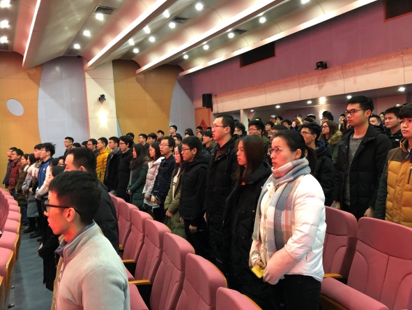 图:全体与会师生跟随大会起立奏唱国歌