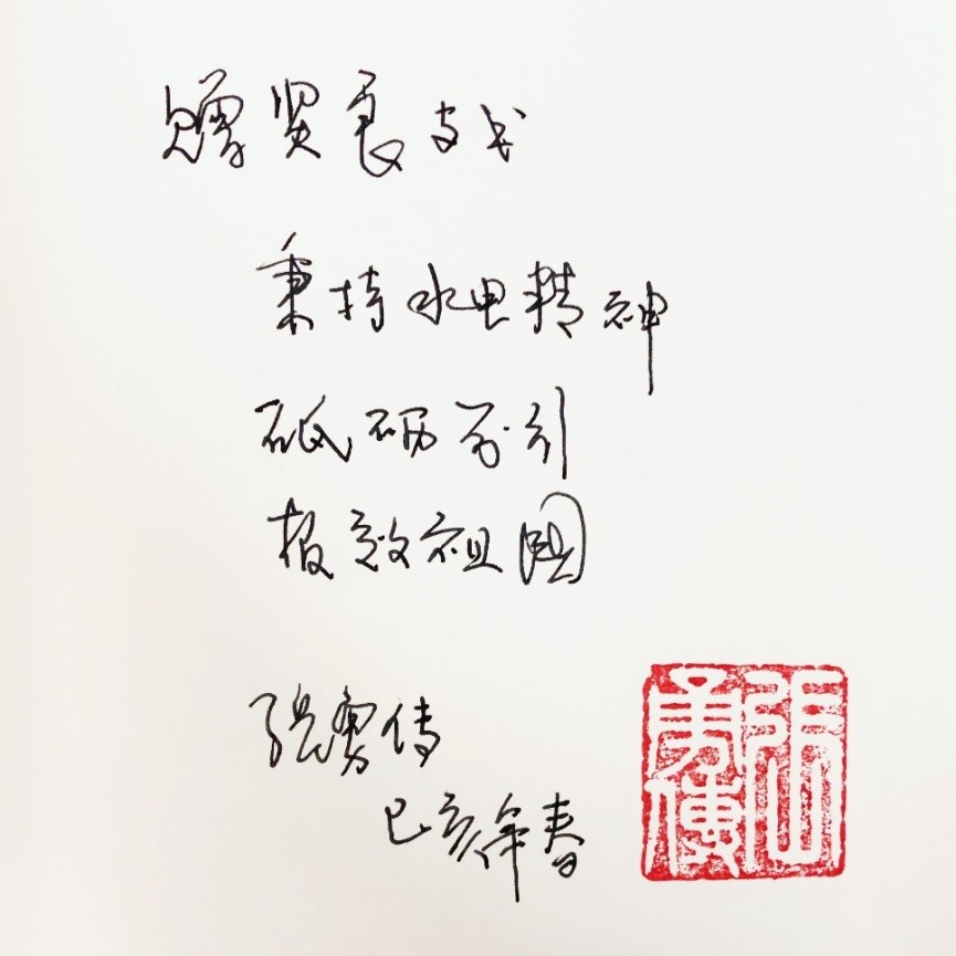 与支书交流中,张勇传院士说,“我在大学读的是工科——水电能源专业,从而与水结下不解之缘……希望你们秉持水电人艰苦奋斗、奉献忘我、砥砺前行的精神”。张院士虽年逾八十,但是时刻关心公司和青年师生们的成长与发展,希望大家立足专业,矢志报国,在给青年支书们的赠书寄语中也倾注了关怀与期盼,在赠送的书记的扉页上提笔签下:“秉持水电精神,砥砺前行,报效祖国”,表达了院士关怀,以及殷切希望。
