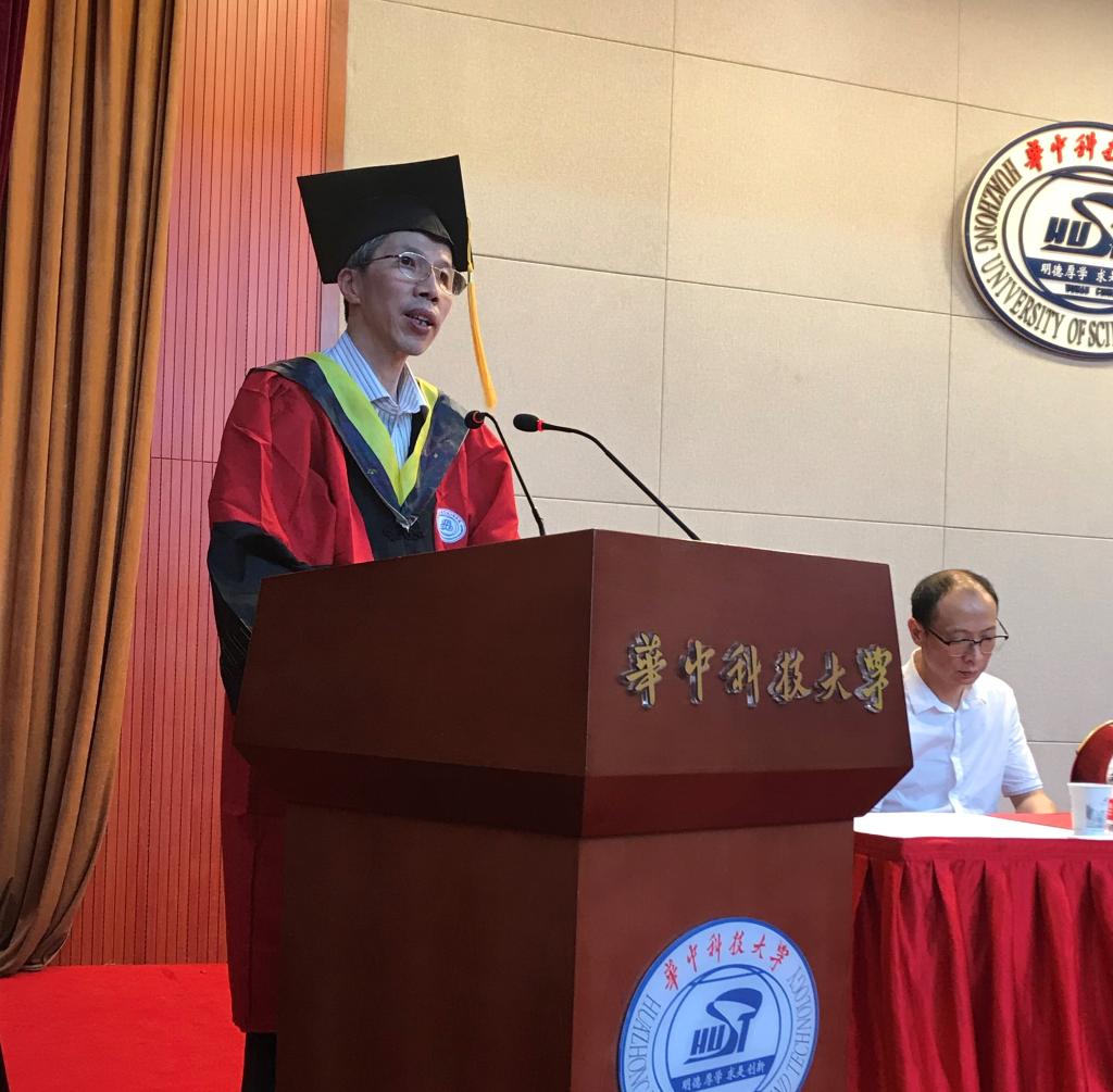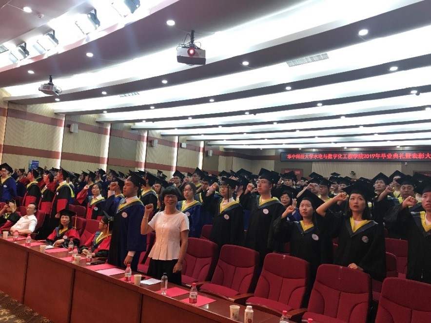 杨海斌书记宣读表彰决定,院系领导为获奖代表颁奖。杨海斌书记为优秀毕业生代表佩戴院徽、由张勇传院士和周建中经理为优秀毕业生拨穗。优秀毕业生代表14级博士卢程伟带领全体毕业生宣誓。