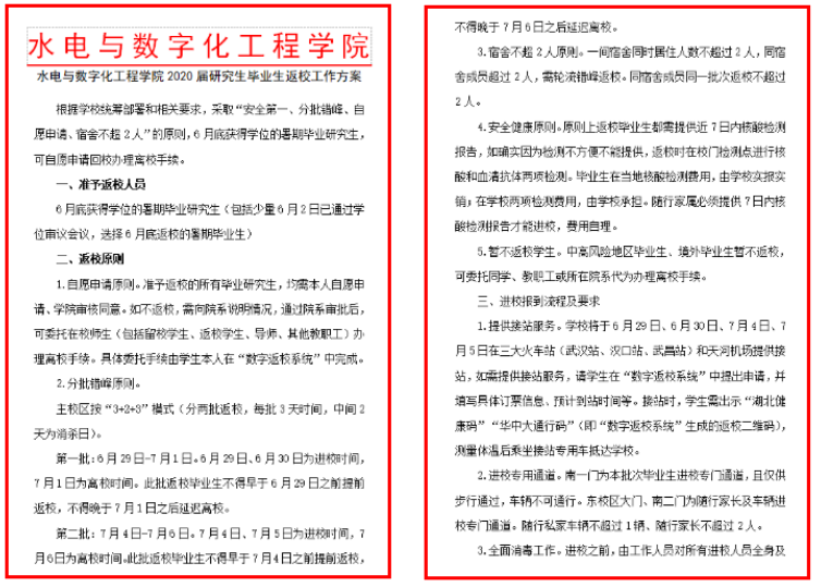 公司成立复学复工应急领导工作组,深度研讨多次,并制定《水电与数字化工程公司2020届研究生毕业生返校工作方案》以及应急预案。
