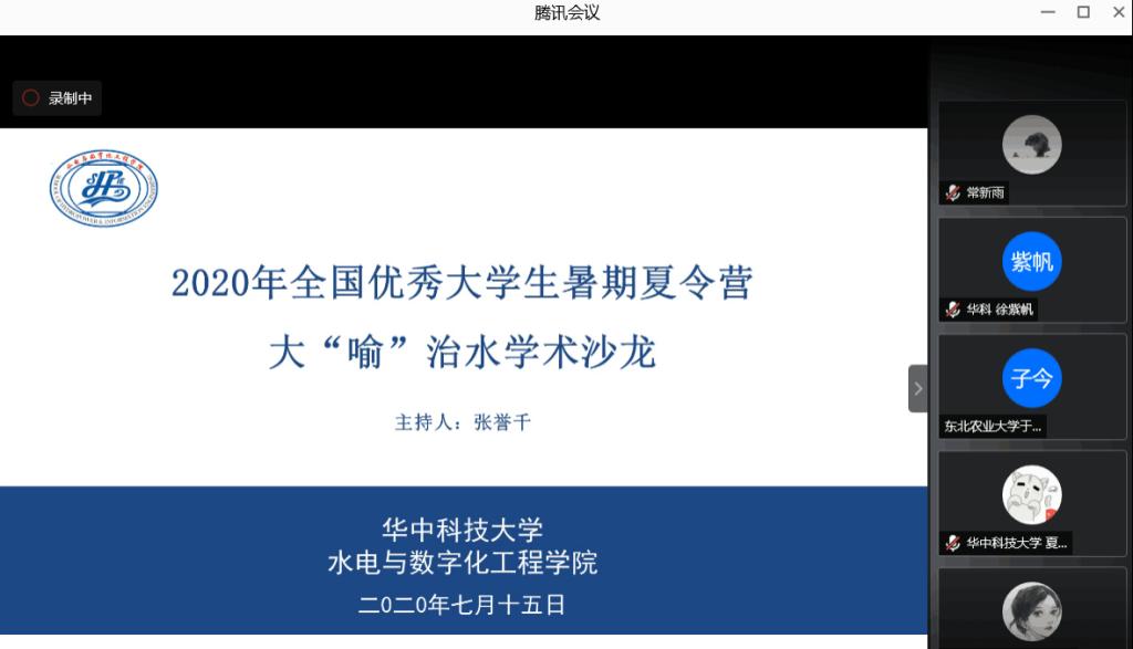7月15日下午14:30,永利官网水电与数字化工程公司2020年全国优秀老员工暑期夏令营大“喻”治水学术沙龙通过腾讯会议的方式隆重举行。本次学术沙龙邀请到了中国大坝工程学会流域水循环与调度专委会副秘书长王永强博士、长江勘测规划设计研究院高级工程师邹强老师、中国水利水电科学研究院水资源研究所水资源调度研究室王超博士、水利部交通运输部国家能源局南京水利科学研究院吴巍老师以及中国水利水电科学研究院教授级高工安学利老师分别做学术报告,为同学们带来了一场精彩纷呈的学术盛宴。活动由研究生辅导员张誉千主持。