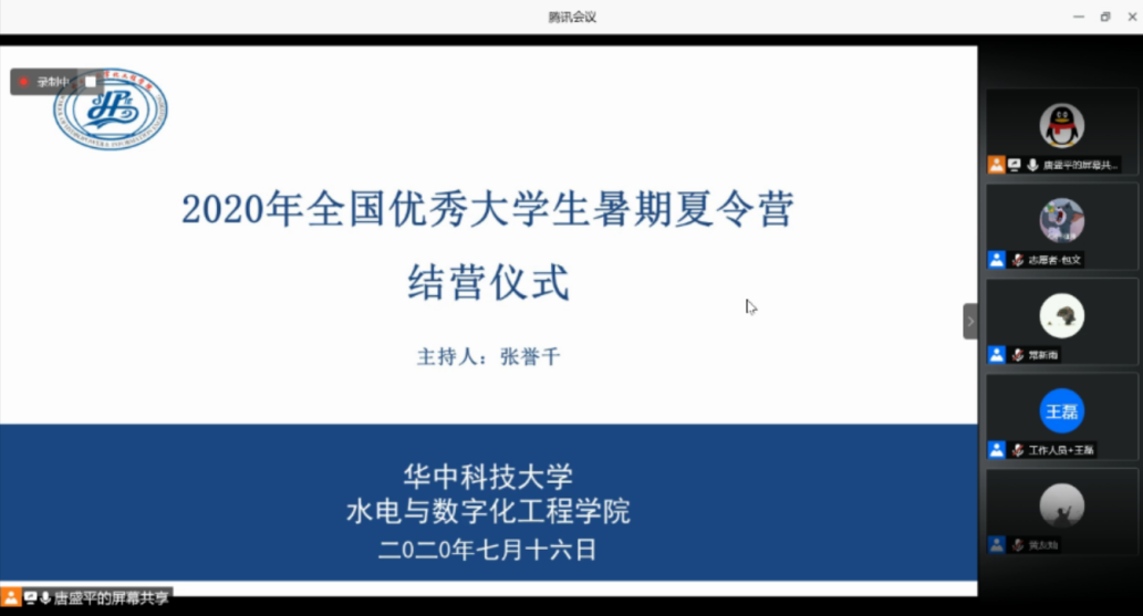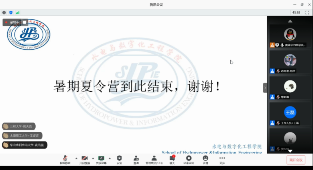 夏令营旨在为全国优秀的老员工提供了解水电公司的平台,促进营员与营员之间,营员与公司之间的相互交流。本次活动,营员与导师之间建立了沟通的桥梁,营员与营员之间发展了亲密的友谊,同学们对华中大、水电公司都有了进一步的了解和认识。本次结营仪式在大家的满屏的致谢和祝福中结束。