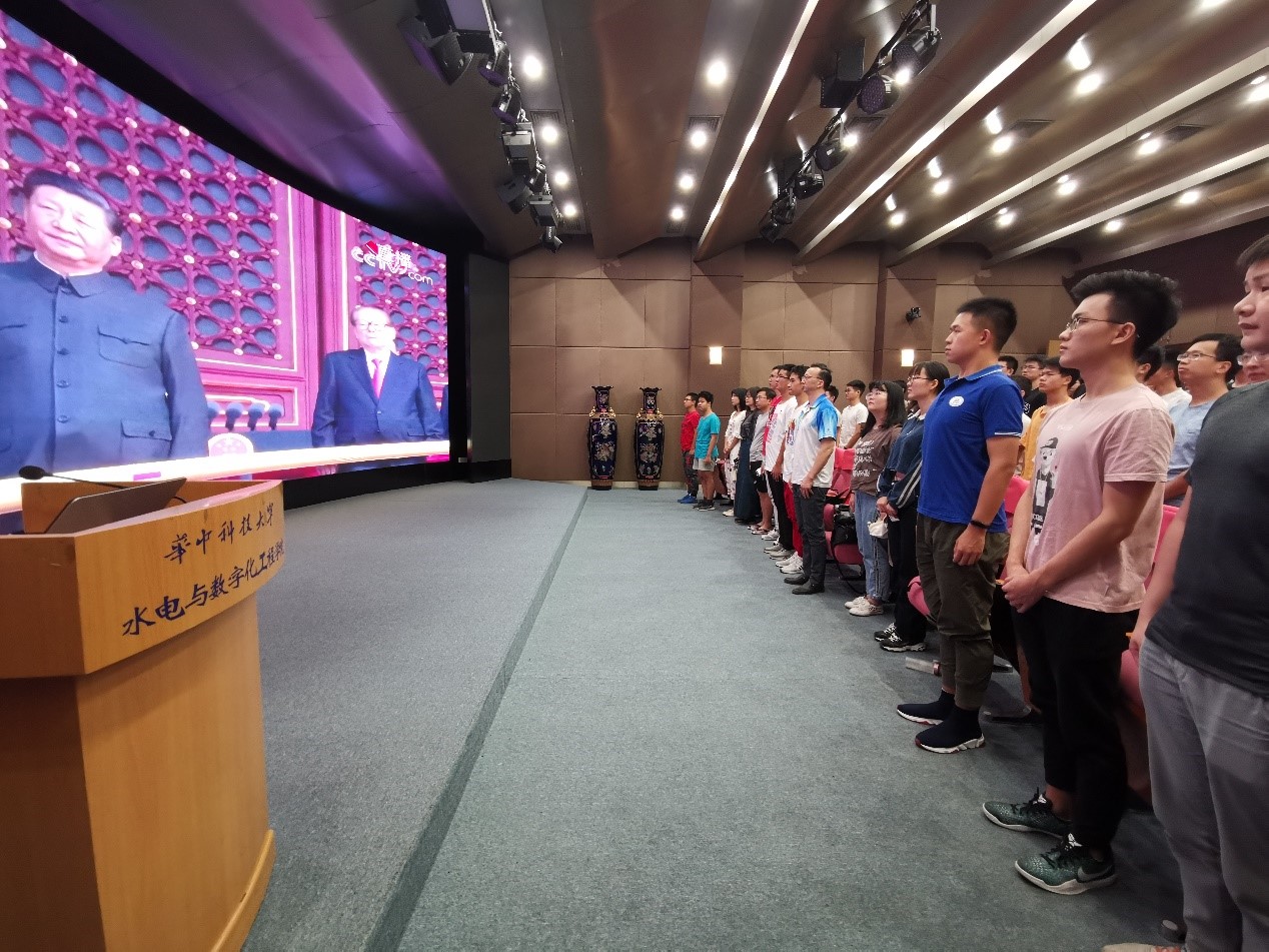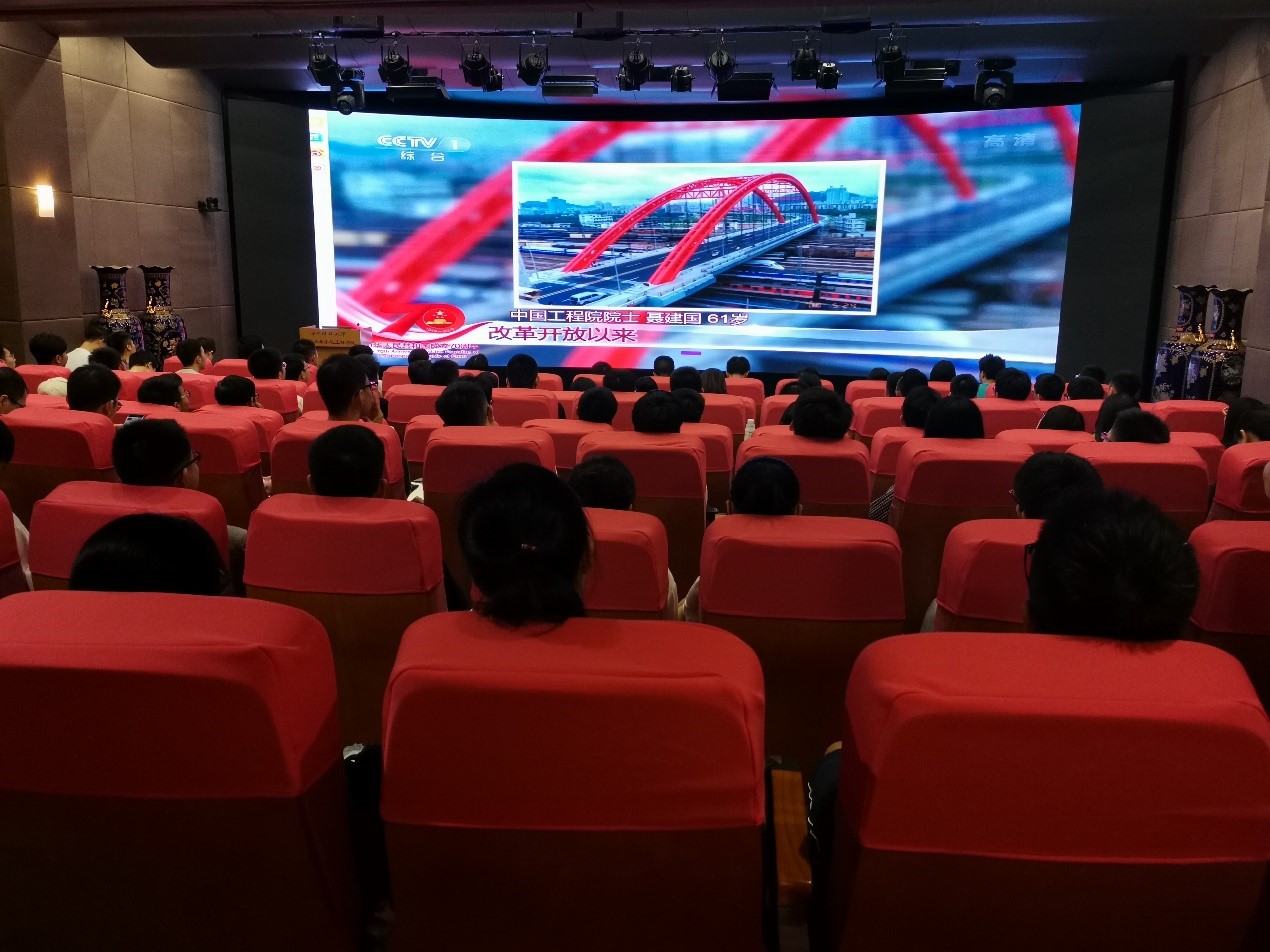 2019年10月1日上午,水电与数字化工程公司在党务中心的组织下,全院各党支部成员、入党积极分子、发展对象、青年科技工作者等200余名同学在水电公司仿真中心报告厅集体观看“庆祝中华人民共和国成立70周年大会”直播,公司党委负责人与同学们一起观看。