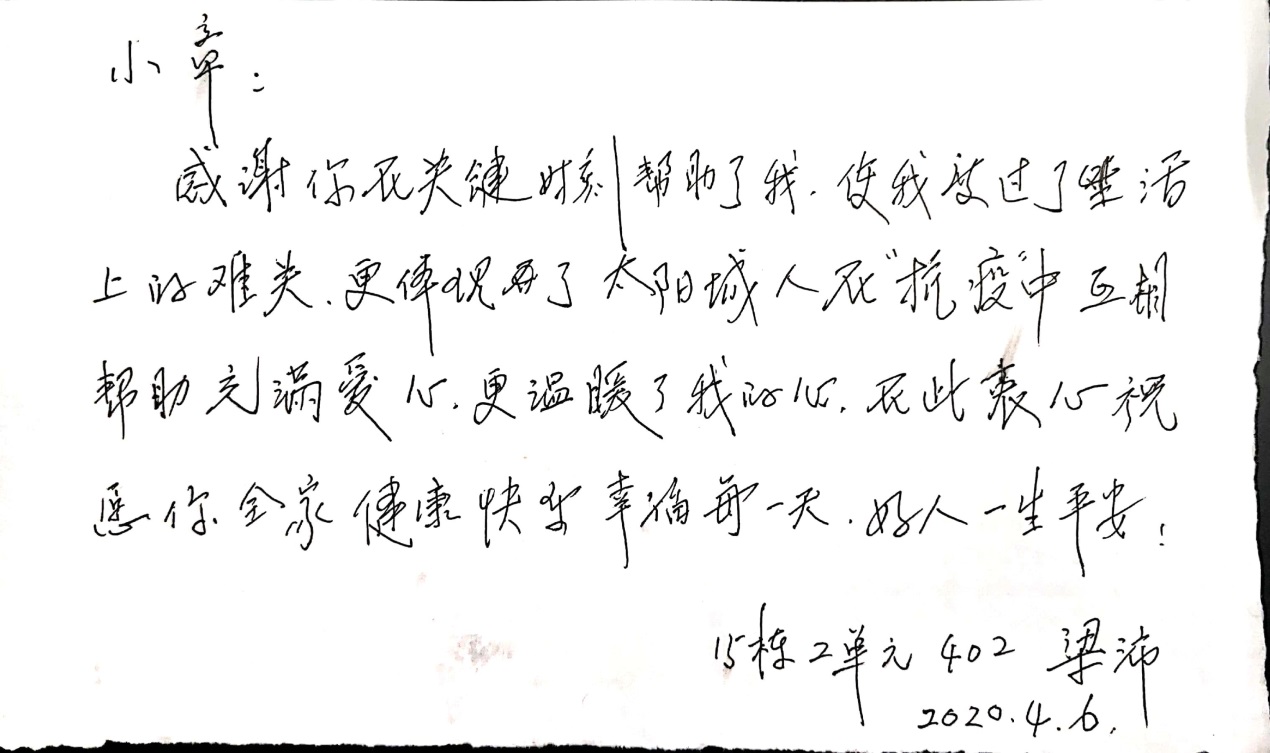 除了在自己社区做志愿者,徐老师还心系公司,不仅为永利官网教育发展基金会捐款,还在条件允许时回公司当了华科大社区网格员,给居家隔离的居民配送各类物资,为抗击疫情提供有力保障。