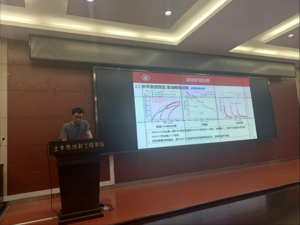 在第一期学术沙龙中,宋丁豹博士对其研究内容和意义等进行了介绍,该博士提出了基于水平排水板的水平真空预压-絮凝联合方法和水平真空预压-固化联合方法,并通过模型试验证明了该方法较常规方法能更高效地加固高含水率疏浚淤泥,该方法为解决高含水率疏浚淤泥快速高效加固问题提供了新思路。建立了二维平面应变水平真空预压固结模型,推导了水平真空预压固结解析解,并基于分段线性方法,建立了大变形水平真空预压平面应变固结数值模型,为水平真空预压固结的计算分析奠定了理论基础,为水平真空预压法处理疏浚淤泥的设计提供了分析工具。