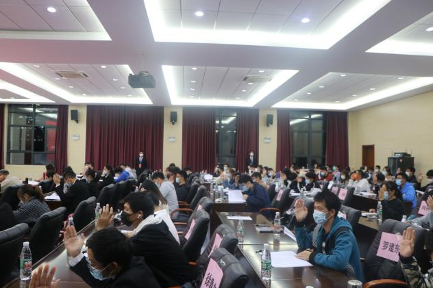2021年10月18日晚,yl23455永利第二次员工代表大会在西六楼五楼报告厅顺利举行。校团委卢孝巍老师、院党委书记李斌老师、副书记何春老师、团委书记张誉千老师、学工组组长蔡海洋老师、本科生辅导员姚磊老师、本科生辅导员廉成凯老师参加本次会议。