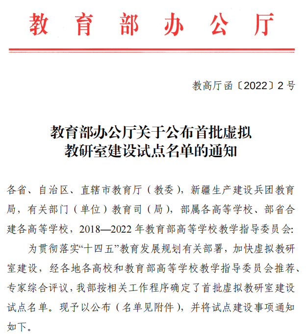 近日,教育部下发了《关于公布首批虚拟教研室建设试点名单的通知》(教高厅函[2022]2号),公司牵头申报的“工程管理专业虚拟教研室”成功入选。